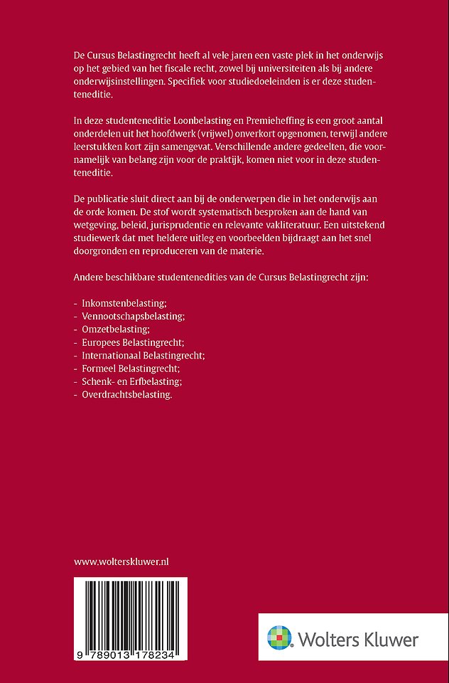 Studenteneditie Cursus Belastingrecht Loonbelasting/Premieheffing 2025-2026 dient als studieboek voor zowel universiteiten als hbo-instellingen. De titel is van grote waarde voor de opleidingen Fiscaal recht, Accountancy en Finance Tax Advice. De studenteneditie wordt jaarlijks volledig geactualiseerd aan de hand van nieuwe wetgeving, verschenen jurisprudentie en van belang zijnde andere ontwikkelingen en vakliteratuur