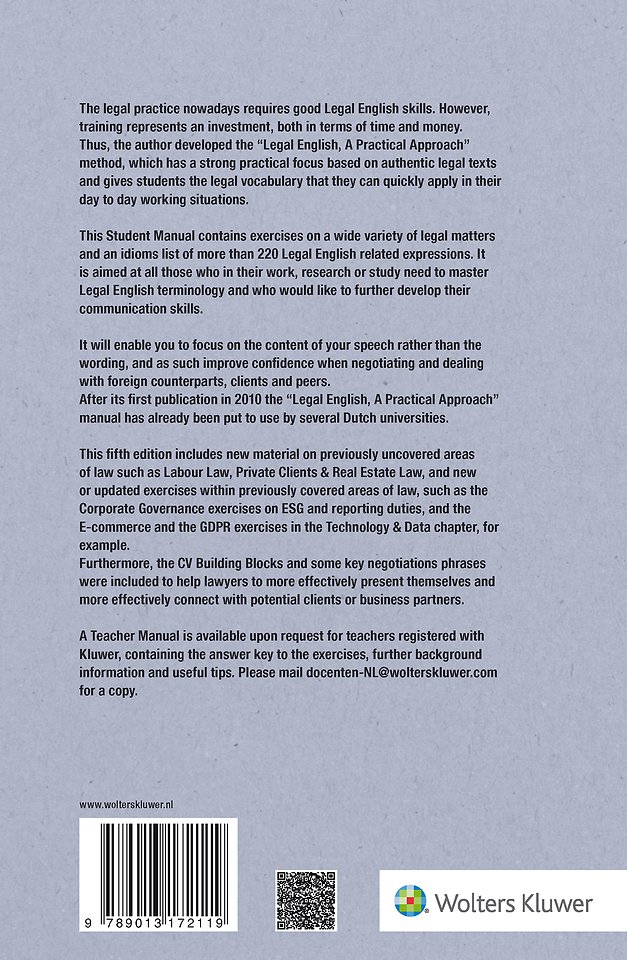 This fifth edition covers advances in vocabulary related to legal trends & developments, such as GDPR, and ESG & reporting duties, plus it includes new material on previously uncovered areas of law such as Labour Law,and Private Clients & Real Estate Law. Furthermore, the CV Building Blocks and some key negotiations phrases were included to help lawyers to more effectively present themselves and connect with potential clients or business partners.