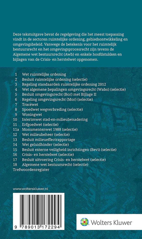 De uitgave biedt u een naslagwerk met daarin alle relevante regelgeving die van pas komen in uw dagelijkse werkzaamheden, inclusief de laatste wetswijzigingen per 1 januari 2023. De opgenomen regelgeving bestrijkt een breed terrein. Nog niet het komende omgevingsrecht (Omgevingswet) is opgenomen, maar wel de huidige regelgeving omtrent ruimtelijke ordening en ruimtelijk relevant milieurecht, alsmede wetgeving over infrastructuur. In de eveneens opgenomen Algemene wet bestuursrecht (Awb) is het algemene bestuursprocesrecht geregeld die op de in deze uitgave verzamelde regelgeving van toepassing is, waaronder de regelen omtrent besluitvorming en rechtsbescherming.