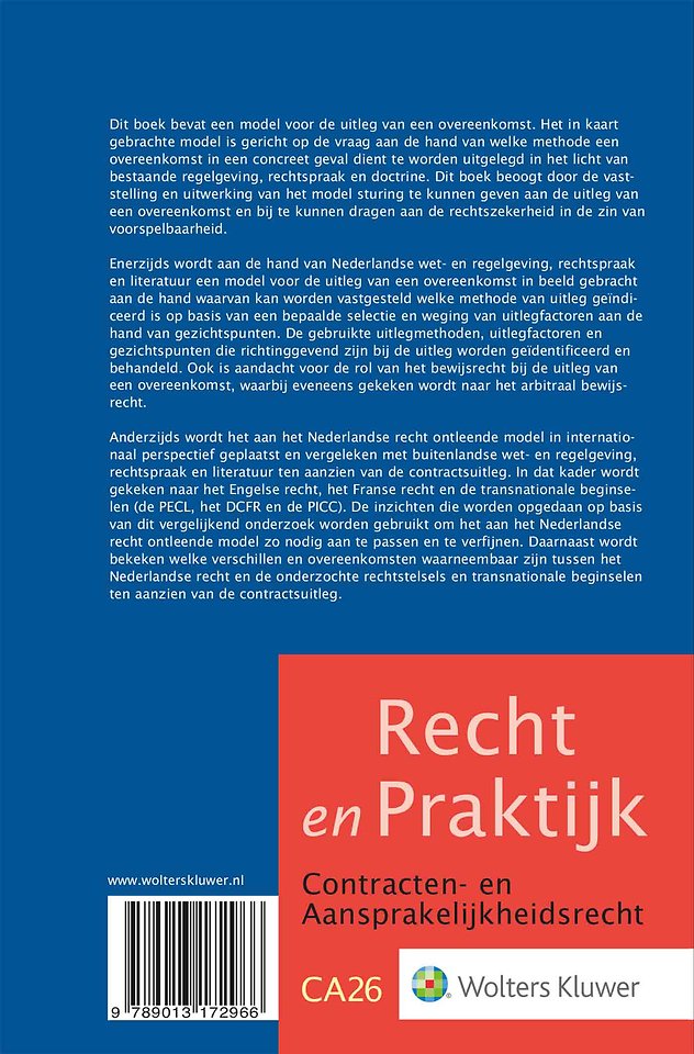 In deze uitgave wordt enerzijds een model voor de uitleg van een overeenkomst in beeld gebracht, aan de hand van Nederlandse wet- en regelgeving, rechtspraak en literatuur. Op basis daarvan kan worden vastgesteld welke methode van uitleg geïndiceerd is op basis van een bepaalde selectie en weging van uitlegfactoren aan de hand van gezichtspunten. De gebruikte uitlegmethoden, uitlegfactoren en gezichtspunten die richtinggevend zijn bij de uitleg worden geïdentificeerd en behandeld. Ook is aandacht voor de rol van het bewijsrecht bij de uitleg van een overeenkomst, waarbij eveneens gekeken wordt naar het arbitraal bewijsrecht.