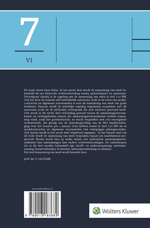 Asser-deel 7-VI Aanneming van werk biedt een actueel overzicht van de wetenschappelijke en maatschappelijke ontwikkelingen en rechtspraak met betrekking tot de aanneming van werk, evenals andere in de praktijk voorkomende samenwerkingsvormen tussen aannemer en opdrachtgever. De auteurs werpen een brede blik op de aanneming van werk. Enerzijds krijgt de lezer inzicht in de aannemingsovereenkomst in bilateraal verband tussen aannemer en opdrachtgever, die is geregeld in de wet. Vertrekpunt daarbij is de regeling van de aanneming van werk in titel 7.12 BW. Anderzijds wordt stilgestaan bij de vele multilaterale samenwerkingsverbanden die bestaan voor de aanneming van werk: hoofd- en onderaanneming, nevenaanneming, bouwcombinatie, bouwteam, ketensamenwerking en alliantie. Daarnaast wordt ingegaan op meer algemene vermogensrechtelijke en goederenrechtelijke onderwerpen die relevant zijn voor de bouwrechtjurist.