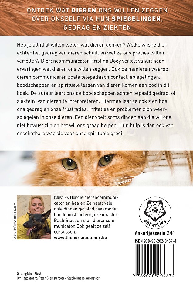 Heb je altijd al willen weten wat dieren denken? Welke wijsheid er achter het gedrag van dieren schuilt en wat ze ons precies willen vertellen? Dierencommunicator Kristina Boey vertelt vanuit haar ervaringen wat dieren ons willen zeggen. Ook de manieren waarop dieren communiceren zoals telepathisch contact, spiegelingen, boodschappen en spirituele lessen van dieren komen in dit boek aan bod. De auteur leert ons de boodschappen achter bepaald gedrag, of ziekte(n) van dieren te interpreteren. Hiermee laat ze ook zien hoe ons gedrag en onze frustraties, irritaties en problemen zich weerspiegelen in onze dieren. Een dier voelt soms dingen aan die wij ons niet bewust zijn en het wil ons graag helpen. Hun hulp is dan ook van onschatbare waarde voor onze spirituele groei.