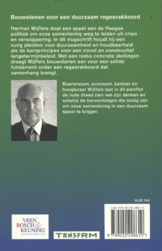 Herman Wijffels doet in zijn auteursdebuut een appèl aan de Haagse politiek. Hij houdt een vurig pleidooi voor duurzaamheid en houdbaarheid als de kernprincipes voor een zinvol en constructief langetermijnbeleid. Met een reeks concrete stellingen draagt Wijffels bouwstenen aan voor een solide fundament onder een regeerakkoord dat samenhang brengt.