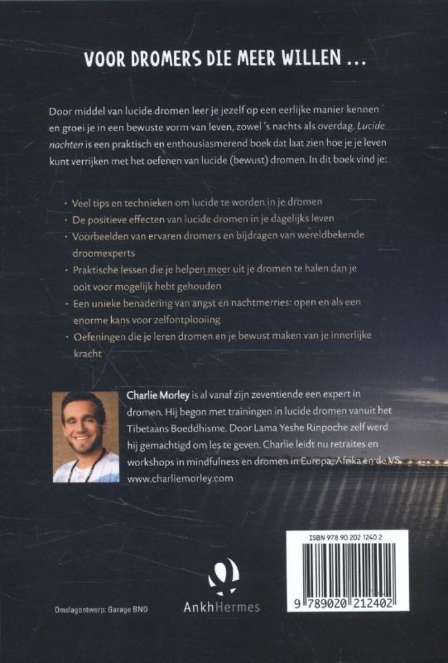 Lucide nachten van Charlie Morley is een heel praktisch en enthousiasmerend boek dat laat zien hoe je je leven kunnen verrijken met het oefenen van bewust dromen. Met tips en technieken, voorbeelden en ervaringen om 'lucide' te worden in je dromen. Uniek is de manier waarop angst en nachtmerries worden behandeld: open en als een enorme kans tot zelfontplooiing. Charlie Morley wordt door kenners gezien als 'meest authentieke praktijk-man op het gebied van lucide dromen en droom/yoga onderwijs in Europa'.