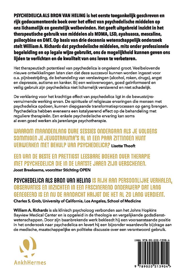 'Psychedelica als bron van heling, ervaringsverhalen en belangrijke doorbraken' van William A. Richards is een van de belangrijkste boeken op het gebied van complementaire geneeswijzen dat de afgelopen tijd is verschenen. Wetenschapper William Richards doet al decennia lang onderzoek naar de helende en transformerende werking van psychedelica, waaronder ayahuasca, MDMA, cannabis en LSD. De cases in 'Psychedelica als bron van heling' zijn hoopvol voor zowel psychische als lichamelijke aandoeningen. Behandelingen bij bijvoorbeeld depressies en verslavingen blijken veel succesvoller als ze ondersteund werden door psychedelica in plaats van traditionele medicatie. Dit boek is een fantastisch naslagwerk voor wie op zoek is naar betrouwbare informatie over andere manieren van genezen dan met alleen reguliere medicatie.