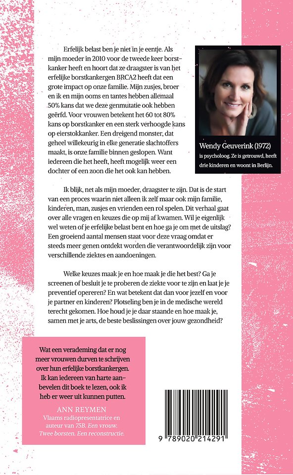 'In mijn familie - Moeilijke medische keuzes rond ziekte en erfelijke aanleg' van Wendy Geuverink is van belang voor iedereen die voor belangrijke keuzes staat op het gebied van gezondheid. In haar boek beschrijft Wendy Geuverink haar persoonlijke verhaal, dat begint als ze eind 2010 te horen krijgt dat ze drager is van het erfelijke borstkankergen BRCA2. Dit borstkankergen is recent veel bekender geworden door Angelina Jolie, die haar medische keuzes openlijk in de media heeft gedeeld nadat ze zichzelf ook geconfronteerd zag met BRCA. Een BRCA2 genmutatie betekent 60 tot 80% kans op het krijgen van borstkanker en een aanzienlijk verhoogde kans op eierstokkanker. Wendy beschrijft op een indringende manier wat dit voor haar en haar gezin betekent en welke ingrijpende keuzes zij maakt om in haar gezonde lijf diverse malen preventief in te grijpen. Naast haar persoonlijke verhaal en zoektocht beschrijft ze helder wat moeilijke medische keuzes inhouden voor iedereen die geconfronteerd wordt met een erfelijke aanleg of een ziekte met ernstige consequenties. Ze wil door haar verhaal en door informatie en adviezen over onderwerpen als 'gedeelde besluitvorming met je arts', 'wil je wel weten of je zelf ook erfelijk belast bent?' en 'hoe blijf je goed in contact met je familie, partner en kinderen?' die groep een steun in de rug geven.