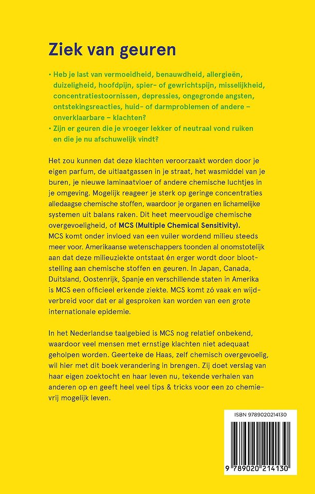 MCS (Multiple Chemical Sensitivity) staat voor meervoudige chemische overgevoeligheid. Geerteke de Haas, auteur van 'Geur- en chemicaliën overgevoeligheid' lijdt aan deze ziekte. Het duurde 25 jaar voordat deze diagnose gesteld kon worden. In dit boek deelt ze haar ervaringen in tips. Het zal veel mensen met (onverklaarbare) allergieën de ogen openen!