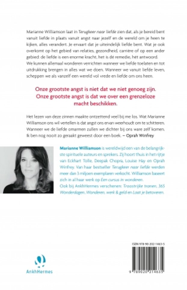 ‘Onze grootste angst is niet dat we niet genoeg zijn. Onze grootste angst is dat we over grenzeloze macht beschikken. Het lezen van deze zinnen maakte ontzettend veel bij me los. Wat Marianne ons probeert te vertellen is dat angst ons tegenhoudt te schitteren, maar wanneer we liefde omarmen zullen we dichter bij ons ware zelf komen. Ik ben nog nooit zo geraakt door een boek.’ – Oprah Winfrey
