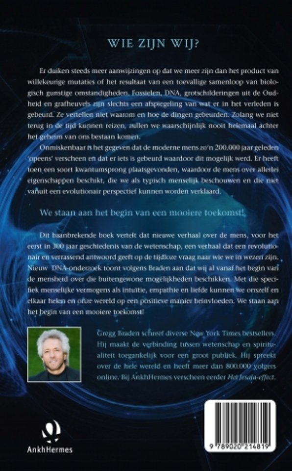 Dit baanbrekende boek vertelt dat nieuwe verhaal over de mens, voor het eerst in 300 jaar geschiedenis van de wetenschap, een verhaal dat een revolutionair en verrassend antwoord geeft op de tijdloze vraag naar wie we in wezen zijn. Nieuw DNA-onderzoek toont volgens Braden aan dat wij al vanaf het begin van de mensheid over die buitengewone mogelijkheden beschikken. Wij zijn zo ontworpen. Met die specifiek menselijke vermogens als intuïtie, empathie en liefde kunnen we onszelf en elkaar helen en onze wereld op een positieve manier beïnvloeden. We staan aan het begin van een mooiere toekomst!