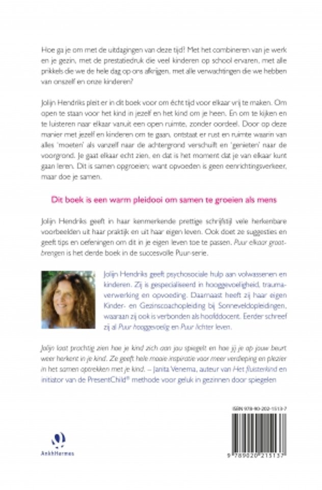 Puur elkaar grootbrengen, hoe (hooggevoelige) volwassenen en kinderen samen kunnen opgroeien van Jolijn Hendriks is het derde deel in haar succesvolle PUUR-reeks. Dit boek is bedoeld voor iedereen die openstaat voor het kind in zichzelf en het kind om zich heen. Kijken en luisteren naar elkaar vanuit een open ruimte (zonder oordeel) maakt dat we anders zien. Dan ontstaat er een open cirkel van pure ontmoeting, waarin we elkaar kunnen grootbrengen. In een tijd waarin zowel ouders als kinderen veel druk ervaren van onder andere school, werk en verwachtingen, schiet dit er nogal eens bij in. Dit boek is een pleidooi om écht tijd voor elkaar vrij te maken. We kunnen veel van elkaar leren als we er de tijd voor nemen.