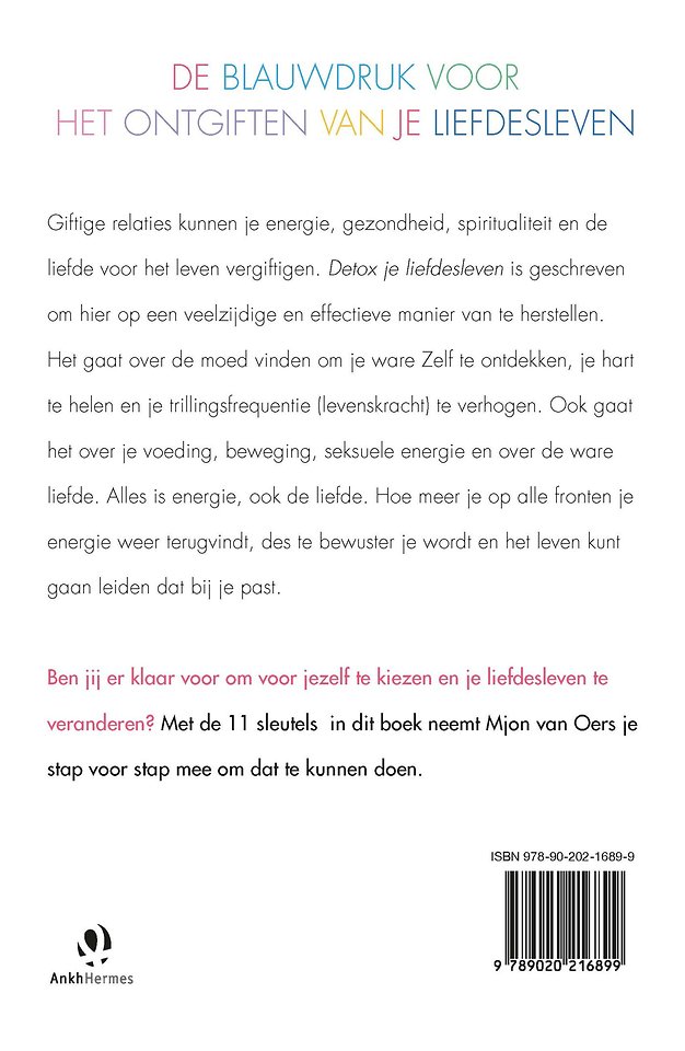 In 'Detox je liefdesleven, Herstellen van giftige relaties' van Mjon van Oers leer je om je liefdesleven te detoxen in vijf niveaus. Hoe kun je gezonde relaties aantrekken nadat je giftige relaties vaarwel hebt gezegd? 'Detox je liefdesleven' is een blauwdruk voor het ontgiften van je liefdesleven om je relaties naar een hoger niveau te brengen, inclusief die met jezelf. Giftige relaties voelen slecht aan en putten je uit. Dit boek biedt strategieën voor iedereen die uit een relatie met een narcist of psychopaat komt of een andere, giftige relatie heeft overleefd. Het helpt je om jezelf terug te vinden, de pijn te elimineren, je onzekerheid te overwinnen en je onrust te temmen. Mjon van Oers geeft je de sleutels in handen om op vijf niveaus; mentaal, fysiek, emotioneel, spiritueel en energetisch te kunnen herstellen. Deze holistische aanpak zorgt voor meer bewustzijn, respectvollere relaties en brengt je zin in het leven weer terug.