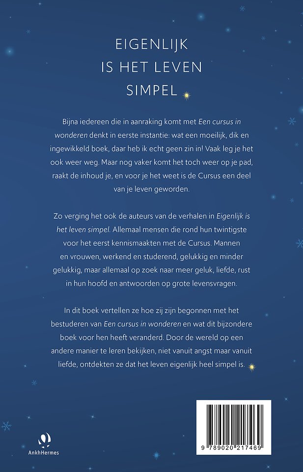 Een cursus in wonderen is een dik, donkerblauw boek. Je kunt je leven lang student zijn van de Cursus. In Eigenlijk is het leven simpel delen jongeren hoe de Cursus hun leven heeft veranderd. Zij vertellen hoe zij zijn begonnen met het bestuderen van een boek dat in eerste instantie weerstand oproept, maar op den duur bijzondere lessen bevat voor wie zich open durft te stellen. De ervaringen gaan in op onderwerpen zoals niet-oordelen en vergeving in het leven van jongeren.