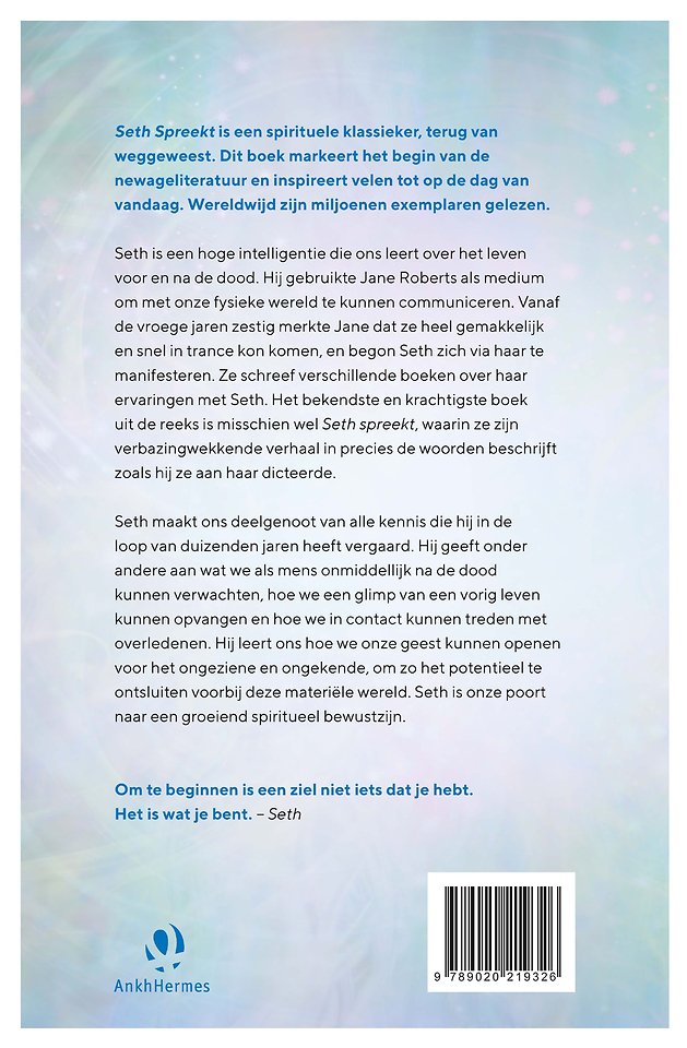 Seth spreekt van Jane Roberts is een spirituele klassieker, terug van weggeweest. Het boek markeert het begin van de new-age literatuur en inspireert velen tot op de dag van vandaag. Jane Roberts channelde in haar werk de entiteit Seth en verkent een breed scala intrigerende metafysische concepten en het enorme potentieel van het menselijk bewustzijn. Seth laat ons inzien dat we onze eigen werkelijkheid kunnen scheppen met de kracht van onze gedachten. Een boek dat in geen enkele spirituele boekenkast mag ontbreken.