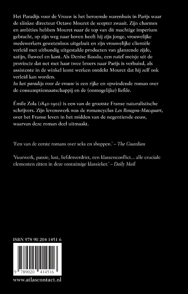 zwaait. Zijn charmes en ambities hebben Mouret naar de top van dit machtige imperium gebracht, op zijn weg naar boven heeft hij zijn jonge, vrouwelijke medewerkers gewetenloos uitgebuit en zijn vrouwelijke clientèle verleid met uitbundig uitgestalde producten van glanzende zijde, satijn, fluweel en kant. Als Denise Baudu, een naïef meisje uit de provincie dat net met haar twee broers naar Parijs is verhuisd, als assistente in de winkel komt werken ontdekt Mouret dat hij zelf ook verleid kan worden. In het paradijs voor de vrouw is een rijke en opwindende roman over de consumptiemaatschappij en de (onmogelijke) liefde.