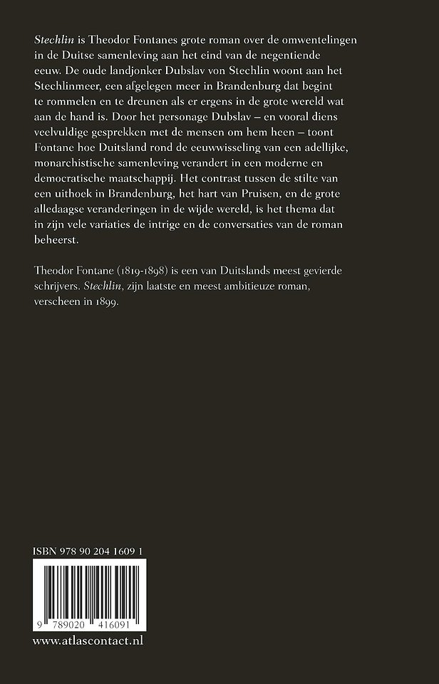 ‘Stechlin’ is Theodor Fontanes grote roman over de omwentelingen in de Duitse samenleving aan het eind van de negentiende eeuw. De oude landjonker Dubslav von Stechlin woont aan het Stechlinmeer, een afgelegen meer in Brandenburg dat begint te rommelen en te dreunen als er ergens in de grote wereld wat aan de hand is. Door het personage Dubslav – en vooral diens veelvuldige gesprekken met de mensen om hem heen – toont Fontane hoe Duitsland rond de eeuwwisseling van een adellijke, monarchistische samenleving verandert in een moderne en democratische maatschappij. Het contrast tussen de stilte van een uithoek in Brandenburg, het hart van Pruisen, en de grote alledaagse veranderingen in de wijde wereld, is het thema dat in zijn vele variaties de intrige en de conversaties van de roman beheerst.