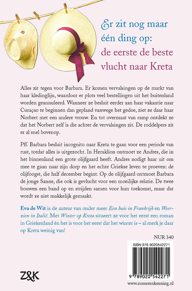 Modeontwerpster Barbara besluit vanwege gedoe op haar werk een paar dagen eerder naar Curaçao te gaan om al aan haar vakantie te beginnen. Daar aangekomen ziet ze haar man Norbert met een andere vrouw. Tot overmaat van ramp komt ze erachter dat Norbert degene is die haar bedrijf dwarsboomt. Verlangend naar rust gaat ze naar Kreta, waar ze echter heel wat meer vindt. Hoe dat afloopt, lees je in 'Winter op Kreta'. Deze nieuwe Eva de Wit is weer net zo fijn als haar eerdere feelgoodtoppers zoals 'Een huis in Frankrijk' en 'Weerzien in Italië'.