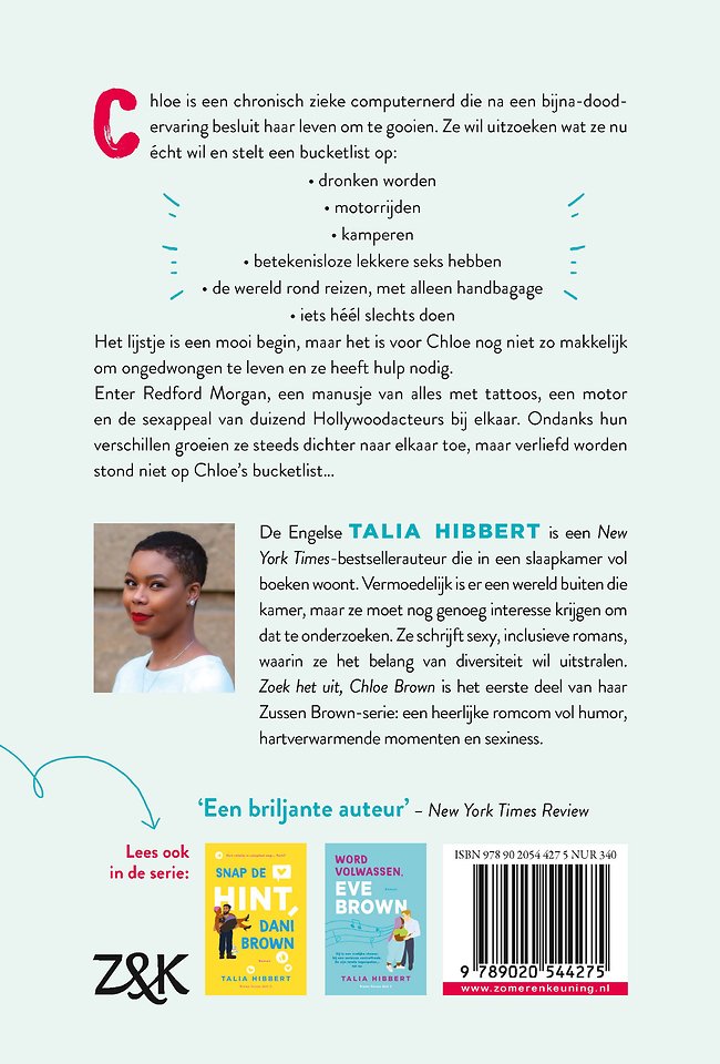 'Zoek het uit, Chloë Brown is het eerste deel van een New Adult-hitserie van Talia Hibbert. De grappige en eerlijke serie stond wekenlang in de Best Romance-bestsellerlijsten van Amazon en Publishers Weekly.