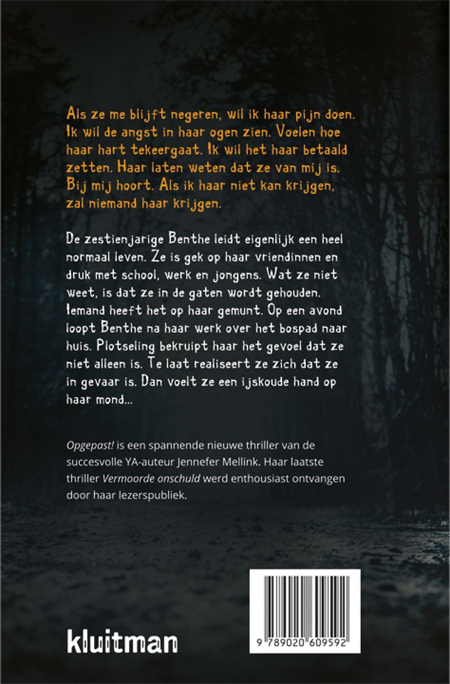 Als Benthe op een avond na haar werk via een bospad naar huis loopt, voelt ze zich niet veilig. Ze wil iemand bellen, maar haar ouders zijn op vakantie en haar broer en beste vriendin nemen hun telefoon niet op. Dan voelt ze opeens een ijskoude hand op haar mond…