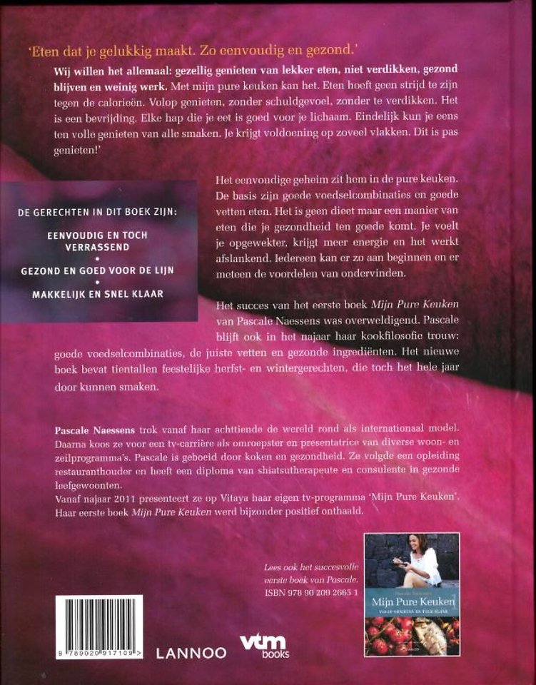 Heerlijk gezonde, mediterraan getinte gerechten die toch eenvoudig en snel te bereiden zijn Wij willen het allemaal: gezellig genieten van lekker eten, niet verdikken, gezond blijven en weinig werk. Met mijn pure keuken kan het. Eten hoeft geen strijd te zijn tegen de calorieën. Volop genieten, zonder schuldgevoel, zonder te verdikken. Het is een bevrijding. Elke hap die je eet is goed voor je lichaam. Eindelijk kun je eens ten volle genieten van alle smaken. Je krijgt voldoening op zoveel vlakken. Dit is pas genieten! Het eenvoudige geheim zit hem in de pure keuken. De basis zijn goede voedselcombinaties en goede vetten eten. Het is geen dieet maar een manier van eten die je gezondheid ten goede komt. Je voelt je opgewekter, krijgt meer energie en het werkt afslankend. Iedereen kan er zo aan beginnen en er meteen de voordelen van ondervinden. Het succes van het eerste boek Mijn Pure Keuken van Pascale Naessens was overweldigend. Pascale blijft ook in het najaar haar kookfilosofie trouw: goede voedselcombinaties, de juiste vetten en gezonde ingrediënten. Het nieuwe boek bevat tientallen feestelijke herfst- en wintergerechten, die toch het hele jaar door kunnen smaken. Ontdek de wereld van Pascale Naessens op www.purepascale.com