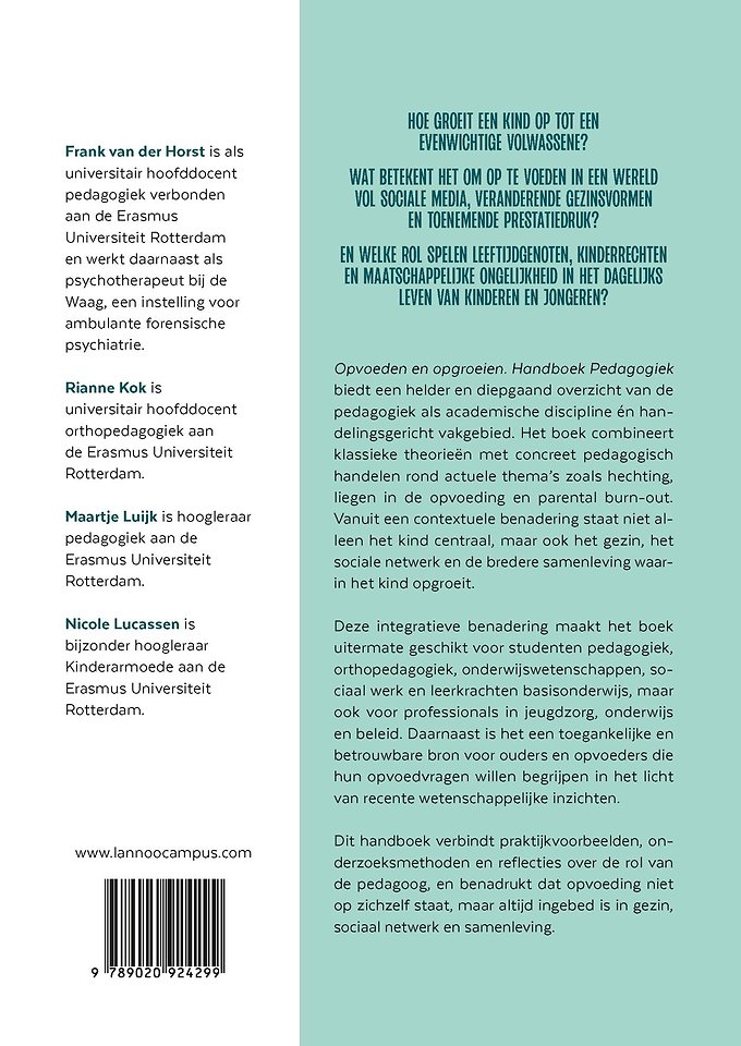 Opvoeden en opgroeien. Handboek Pedagogiek biedt een helder en diepgaand overzicht van de pedagogiek als academische discipline én handelingsgericht vakgebied. Het boek combineert klassieke theorieën met concreet pedagogisch handelen rond actuele thema's zoals hechting, liegen in de opvoeding en parental burn-out. Vanuit een contextuele benadering staat niet alleen het kind centraal, maar ook het gezin, het sociale netwerk en de bredere samenleving waarin het kind opgroeit.