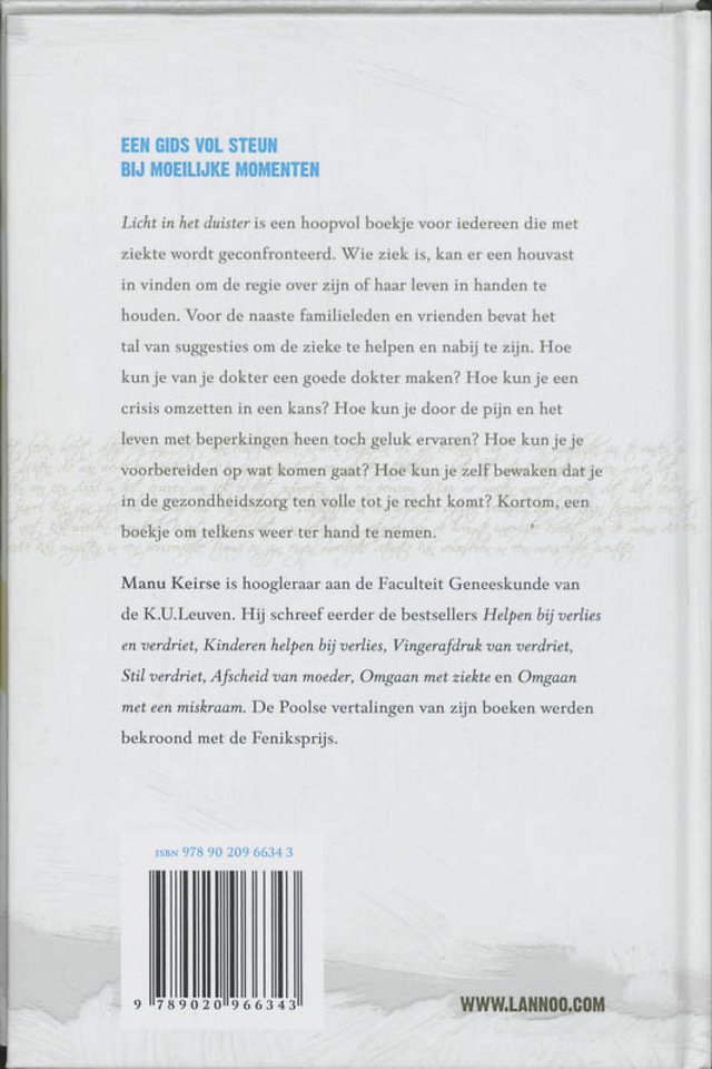 De opvolger van Vingerafdruk van verdriet, het geschenkboek waarvan meer dan 20.000 exemplaren zijn verkocht, en dat vele duizenden mensen hielp om te gaan met hun verdriet om het verlies van een dierbare;;;Het perfecte cadeau voor wie een zieke bezoekt, thuis of in het ziekenhuis, en voor iedereen die in contact komt met artsen en de gezondheidszorg;;;Volledig in kleur en geïllustreerd;;;Een boek dat inspiratie biedt om goed om te gaan met ziekte Licht in het duister is een hoopvol boekje voor iedereen die met ziekte wordt geconfronteerd. Wie ziek is, kan er een houvast in vinden om de regie over zijn of haar leven in handen te houden. Voor de naaste familieleden en vrienden bevat het tal van suggesties om de zieke te helpen en nabij te zijn. Hoe kun je van je dokter een goede dokter maken? Hoe kun je een crisis omzetten in een kans? Hoe kun je door de pijn en het leven met beperkingen heen toch geluk ervaren? Hoe kun je je voorbereiden op wat komen gaat? Hoe kun je zelf bewaken dat je in de gezondheidszorg ten volle tot je recht komt? Kortom, een boekje om telkens weer ter hand te nemen.