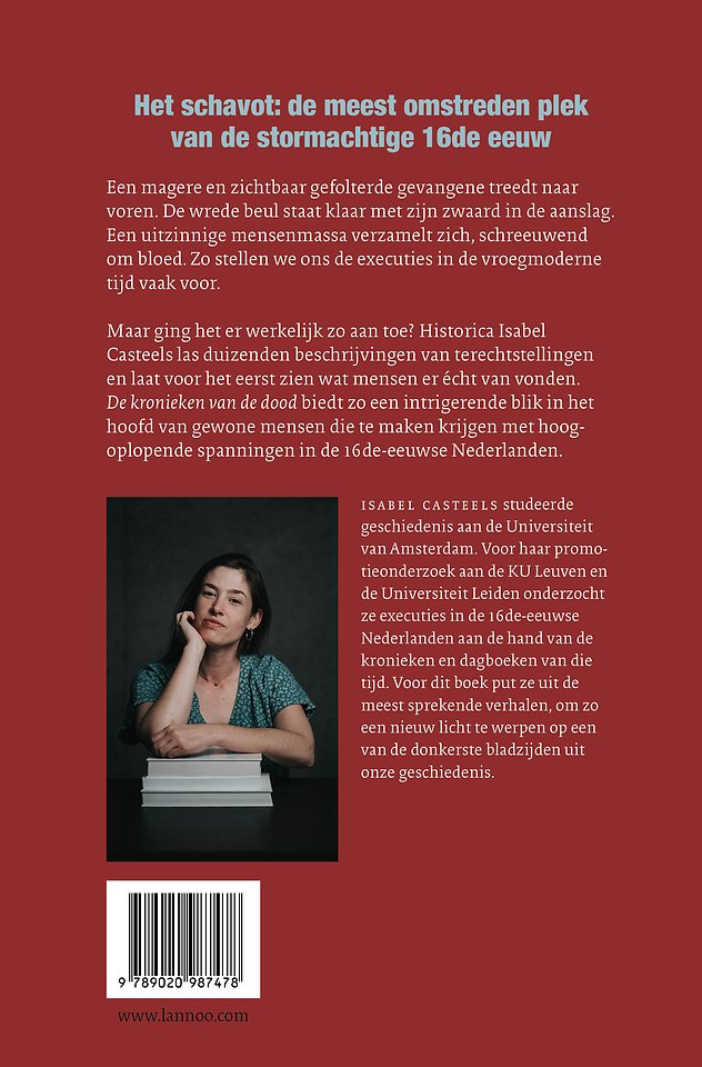 Isabel Casteels studeerde geschiedenis aan de Universiteit van Amsterdam. Voor haar promotieonderzoek aan de KU Leuven en de Universiteit Leiden onderzocht ze executies in de 16de-eeuwse Nederlanden aan de hand van de kronieken en dagboeken van die tijd. Voor dit boek put ze uit de meest sprekende verhalen, om zo een nieuw licht te werpen op een van de donkerste bladzijden uit onze geschiedenis.