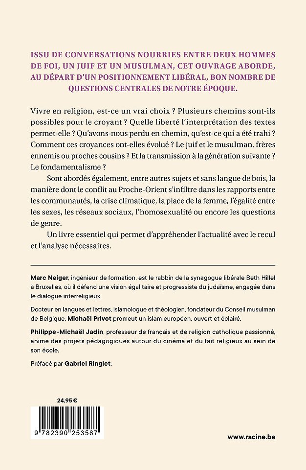 Issu de conversations nourries entre deux hommes de foi, un juif et un musulman, cet ouvrage aborde, au départ d'un positionnement libéral, bon nombre de questions centrales de notre époque.