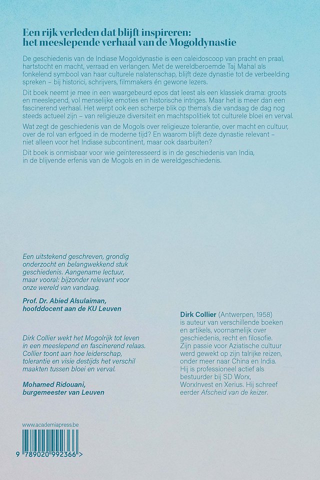 'Dirk Collier wekt het Mogolrijk tot leven in een meeslepend en fascinerend relaas. Een rijk dat boeit omwille van zijn pracht en macht, én omdat het verrassend veel zegt over onze eigen tijd. In een wereld waar culturele diversiteit, religieuze spanningen en geopolitieke onzekerheid almaar prangender worden, toont Collier hoe leiderschap, tolerantie en visie destijds het verschil maakten tussen bloei en verval.'