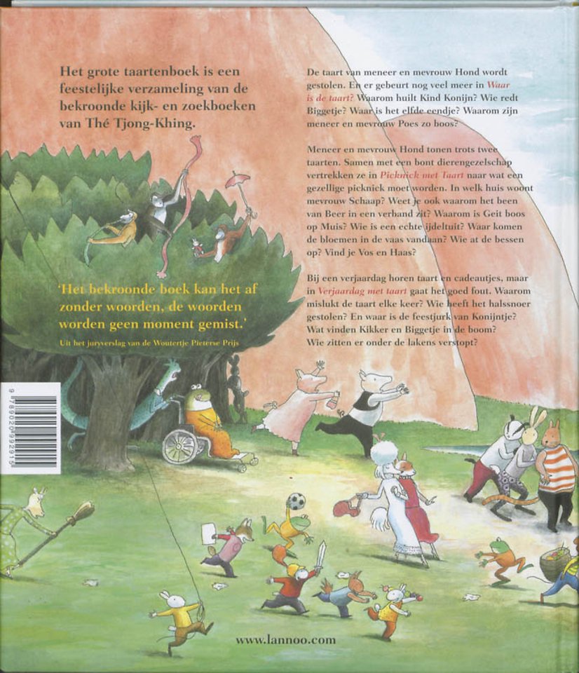 Drie prachtboeken van Thé Tjong-Khing in één band;;;Bind-up van Waar is de taart?, Picknick met taart en Verjaardag met taart;;;Wereldwijd zijn er van de drie titels al meer dan 100.000 ex. verkocht;;;Waar is de taart? werd bekroond met de Woutertje Pieterse Prijs en een Zilveren Penseel en Picknick met taart werd genomineerd voor de Gouden Uil Jeugdliteratuurprijs. Het grote taartenboek is een feestelijke verzameling van de bekroonde kijk- en zoekboeken van Thé Tjong-Khing.
