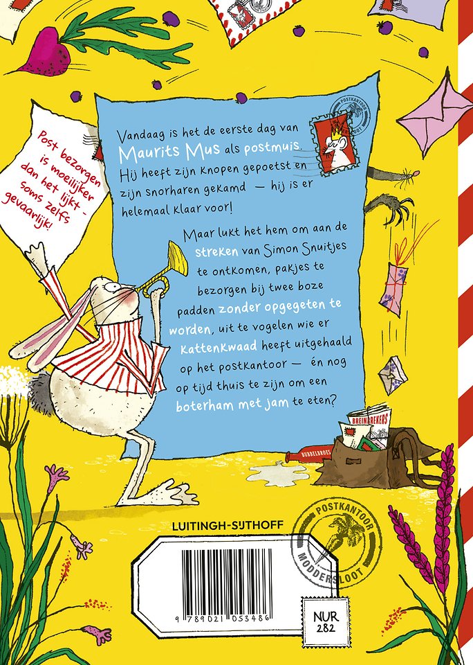 Maar op zijn eerste dag gaat er van alles mis. Hij raakt verdwaald in een ondergronds doolhof (en wordt gered door een maf konijn) en belandt tussen twee ruziënde paddenburen. Post bezorgen is helemaal niet zo makkelijk - soms zelfs gevaarlijk. Lukt het hem om al zijn post te bezorgen? En belangrijker: wordt hij net zo'n goede postmuis als zijn oudtante Ada?
