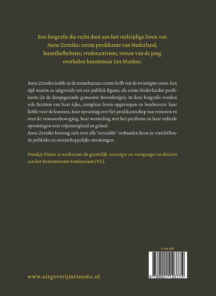 Een biografie die recht doet aan het veelzijdige leven van Anne Zernike: eerste predikante van Nederland, kunstliefhebster, vredesactiviste, vrouw van de jong overleden kunstenaar Jan Mankes.