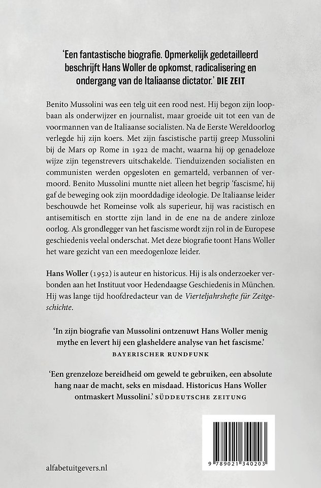 Benito Mussolini was een telg uit een rood nest. Met zijn vlijmscherpe pen werkte hij aan een loopbaan als journalist. Hij groeide uit tot een van de voormannen van de Italiaanse socialistische partij. Maar na de Eerste Wereldoorlog koos hij een andere koers. Met zijn fascistische partij greep Mussolini bij de Mars op Rome in 1922 de macht, waarna hij op genade loze wijze zijn tegenstrevers uitschakelde. Tien duizenden socialisten en communisten werden opgesloten en gemarteld, verbannen of vermoord. Benito Mussolini muntte niet alleen het begrip ‘fascisme’, hij gaf de beweging ook zijn moorddadige ideologie. De Italiaanse leider beschouwde het Romeinse volk als superieur, hij was racistisch en antisemitisch en stortte zijn land in de ene na de andere zinloze oorlog. Als grondlegger van het fascisme wordt zijn rol in de Europese geschiedenis veelal onderschat. Met deze biografie toont Hans Woller het ware gezicht van een meedogenloze leider.