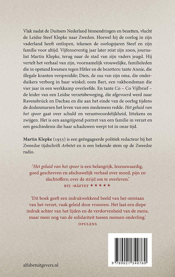 Vlak nadat de Duitsers Nederland binnendringen en bezetten, vlucht de Leidse Steef Klepke naar Zweden. Hoewel hij de oorlog in zijn vaderland heeft ontlopen, tekenen de oorlogsjaren Steef en zijn familie voor altijd. Vijfenzeventig jaar later reist zijn zoon, journalist Martin Klepke, terug naar de stad van zijn vaders jeugd. Hij vertelt het verhaal van zijn voornamelijk vrouwelijke familieleden die in opstand kwamen tegen Hitler en de bezetters: tante Annie, die illegale kranten verspreidde; Dien, de zus van zijn oma, die onderduikers verborg in haar winkel; vakbondsman oom Bart, die vier jaar in een werkkamp overleefde. En tante Co – Co Vijlbrief – de vrouwelijke leider van een Leidse verzetsbeweging, die afgevoerd werd naar Ravensbrück en Dachau en die tijdens de dodenmars het leven van een medemens redde. Het geluid van het spoor gaat over schuld en verantwoordelijkheid, littekens en zwijgen. Het is een aangrijpend portret dat zijn schaduwen werpt tot in onze tijd.lak nadat de Duitsers Nederland binnendringen en bezetten, vlucht de Leidse Steef Klepke naar Zweden. Hoewel hij de oorlog in zijn vaderland heeft ontlopen, tekenen de oorlogsjaren Steef en zijn familie voor altijd. Vijfenzeventig jaar later reist zijn zoon, journalist Martin Klepke, terug naar de stad van zijn vaders jeugd. Hij vertelt het verhaal van zijn voornamelijk vrouwelijke familieleden die in opstand kwamen tegen Hitler en de bezetters: tante Annie, die illegale kranten verspreidde; Dien, de zus van zijn oma, die onderduikers verborg in haar winkel; vakbondsman oom Bart, die vier jaar in een werkkamp overleefde. En tante Co – Co Vijlbrief – de vrouwelijke leider van een Leidse verzetsbeweging, die afgevoerd werd naar Ravensbrück en Dachau en die tijdens de dodenmars het leven van een medemens redde. Het geluid van het spoor gaat over schuld en verantwoordelijkheid, littekens en zwijgen. Het is een aangrijpend portret dat zijn schaduwen werpt tot in onze tijd.