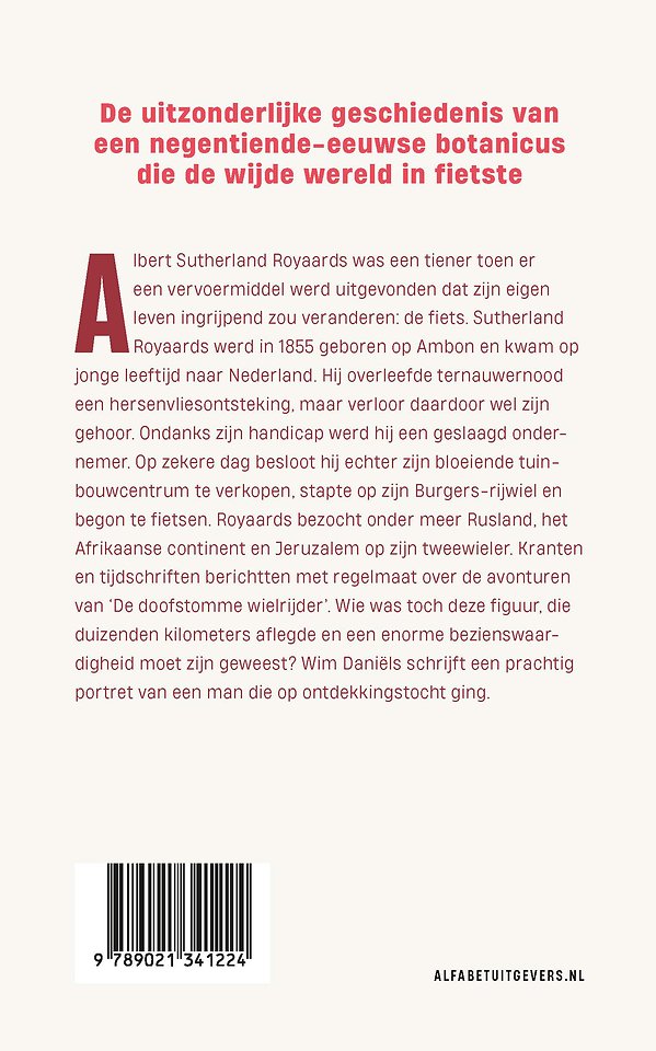 Albert Sutherland Royaards (1855-1900) was een tiener toen er een voertuig werd uitgevonden dat niet alleen de wereld, maar ook zijn eigen leven ingrijpend zou veranderen. Royaards werd geboren op Ambon, overleefde ternauwernood een hersenvliesontsteking en verloor daardoor zijn gehoor. Als kleine jongen maakte hij per boot de lange reis naar Nederland, waar hij, ondanks zijn handicap, een geslaagd ondernemer werd. Op zekere dag besloot hij echter zijn bloeiende tuinbouwhandel te verkopen, stapte op zijn Burgers-rijwiel en begon te fietsen. Royaards bezocht onder meer Rusland, het Afrikaanse continent en Jeruzalem op zijn tweewieler. Kranten en tijdschriften berichtten met regelmaat over de avonturen van ‘de doofstomme wielrijder’. Wie was toch deze figuur, die duizenden kilometers aflegde en een enorme bezienswaardigheid moet zijn geweest? Wim Daniëls schrijft een prachtig portret van een man die op ontdekkingstocht ging.