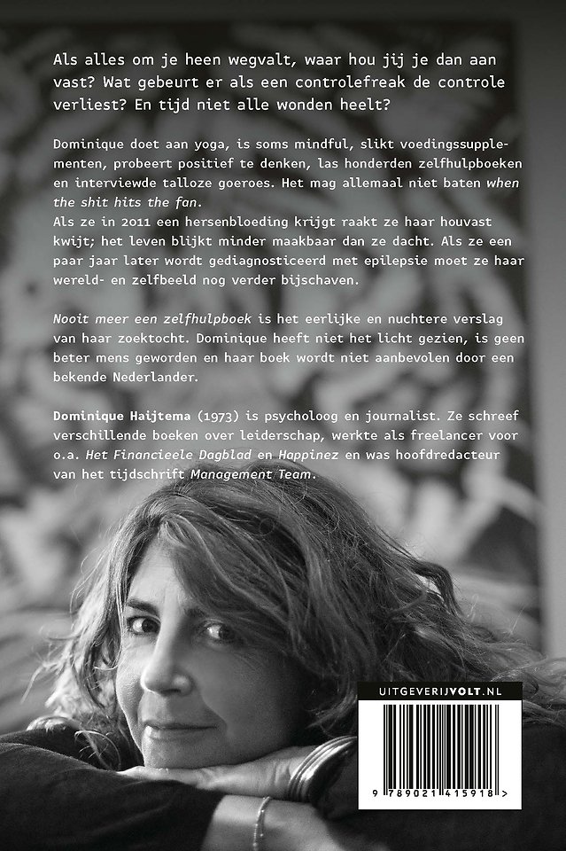 'Nooit meer een zelfhulpboek' is het eerlijke en nuchtere verslag van haar zoektocht. Dominique heeft niet het licht gezien, is geen beter mens geworden en haar boek wordt niet aanbevolen door een bekende Nederlander.