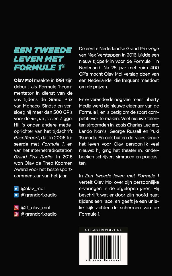 In Een tweede leven met Formule 1 vertelt Olav Mol over zijn persoonlijke ervaringen in de afgelopen jaren. Hij beschrijft wat er door zijn hoofd gaat tijdens een race, en geeft je een unieke kijk achter de schermen van de Formule 1.