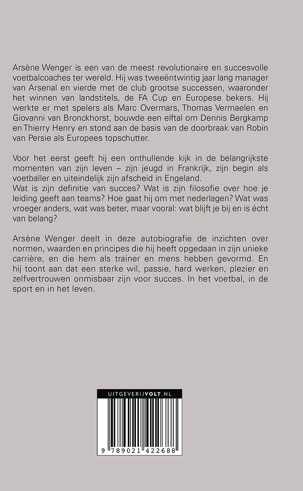 Arsène Wenger deelt in deze autobiografie de inzichten over normen, waarden en principes die hij heeft opgedaan in zijn unieke carrière, en die hem als trainer en mens hebben gevormd. En hij toont aan dat een sterke wil, passie, hard werken, plezier en zelfvertrouwen onmisbaar zijn voor succes. In het voetbal, in de sport en in het leven.
