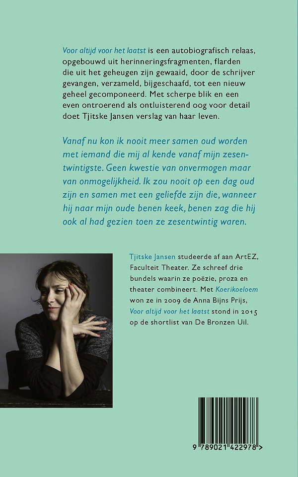 ‘Wat goed is, stijgt boven de etiketten uit,’ schreef De Morgen over Het moest maar eens gaan sneeuwen, het overrompelende poëziedebuut van Tjitske Jansen waarin ze als met de ogen van een kind keek naar haar ervaringen in heden en verleden. In Koerikoeloem beschreef ze haar persoonlijke geschiedenis in sprookjesachtige observaties. Ook Voor altijd voor het laatst heeft een persoonlijke inslag – maar nu drukt Tjitske Jansen zich uit in proza. Met scherpe blik en een even ontroerend als ontluisterend oog voor detail schetst ze een jeugd waarin grote keuzes gemaakt moeten worden. De opgroeiende vrouw die ze portretteert schaaft soms haar huid aan de werkelijkheid, waarin ze tastend maar kordaat haar weg zoekt.