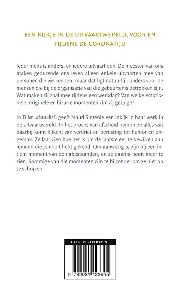 In Tillen, alstublieft geeft Maud Sintenie een inkijk in haar werk in de uitvaartwereld. In het proces van afscheid nemen en alles wat daarbij komt kijken; van verdriet en berusting tot humor en ongemak. Ze laat zien hoe het is om de laatste eer te bewijzen aan iemand die je nooit hebt gekend. Om aanwezig te zijn bij een intiem moment van de nabestaanden, en ze daarna nooit meer te zien. Sommige van die momenten zijn te bijzonder om ze niet op te schrijven.