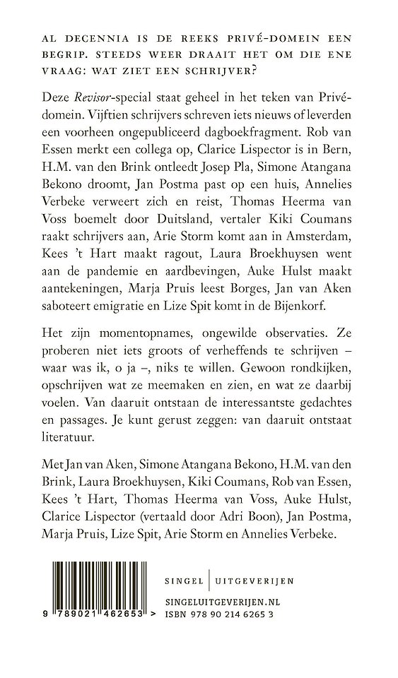 Deze Revisor-special staat geheel in het teken van Privédomein. Vijftien schrijvers schreven iets nieuws of leverden een voorheen ongepubliceerd dagboekfragment. Rob van Essen merkt een collega op, Clarice Lispector is in Bern, H.M. van den Brink ontleedt Josep Pla, Simone Atangana Bekono droomt, Jan Postma past op een huis, Annelies Verbeke verweert zich en reist, Thomas Heerma van Voss boemelt door Duitsland, vertaler Kiki Coumans raakt schrijvers aan, Arie Storm komt aan in Amsterdam, Kees ’t Hart maakt ragout, Laura Broekhuysen went aan de pandemie en aardbevingen, Auke Hulst maakt aantekeningen, Marja Pruis leest Borges, Jan van Aken saboteert emigratie en Lize Spit komt in de Bijenkorf.