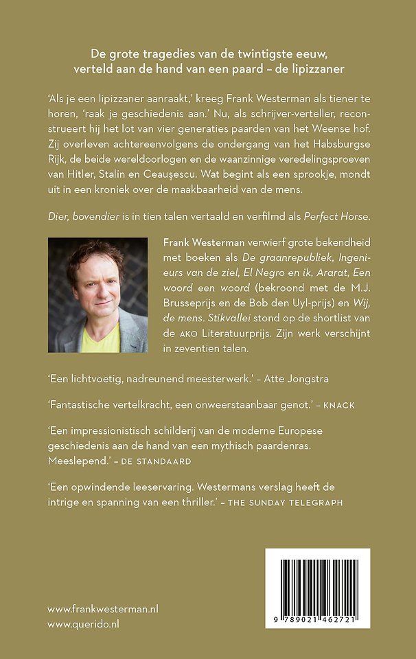 ‘Als je een lipizzaner aanraakt,’ kreeg Frank Westerman als tiener te horen, ‘raak je geschiedenis aan.’ Nu, als schrijver-verteller, reconstrueert hij het lot van vier generaties paarden van het Weense hof. Zij doorstaan achtereenvolgens de ondergang van het Habsburgse Rijk, de beide wereldoorlogen en de waanzinnige veredelingsproeven van Hitler, Stalin en Ceauşescu.