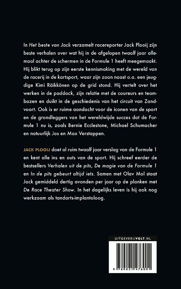 In dit vuistdikke boek Het beste van Jack verzamelt racereporter Jack Plooij zijn beste verhalen over wat hij in de afgelopen twaalf jaar allemaal achter de schermen in de Formule 1 heeft meegemaakt. Hij blikt terug op zijn eerste kennismaking met de wereld van de racerij in de kartsport, waar zijn zoon naast o.a. een jeugdige Kimi Räikkönen op de grid stond. Hij vertelt over het werken in de paddock, zijn relatie met de coureurs en teambazen en duikt in de geschiedenis van het circuit van Zandvoort. Ook is er ruime aandacht voor de iconen van de sport en de grondleggers van het wereldwijde succes dat de Formule 1 nu is, zoals Bernie Ecllestone, Michael Schumacher en natuurlijk Jos en Max Verstappen.
