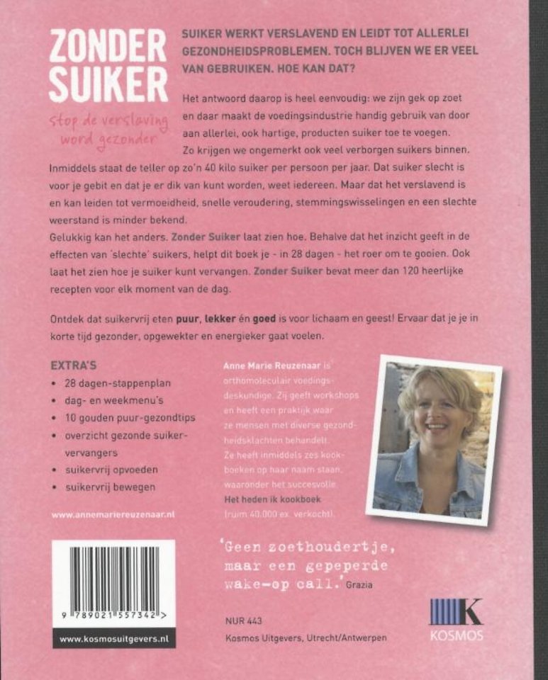 Zonder suiker is de bestseller van Anne Marie Reuzenaar. Dit praktische handboek helpt je om binnen een maand af te kicken. Met dag- en weekmenu’s, overzicht van gezonde suikervervangers en recepten om meteen te starten.