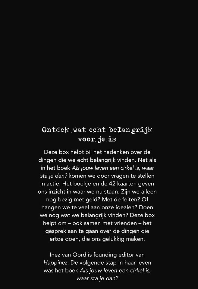 Deze box helpt bij het nadenken over de dingen die we echt belangrijk vinden. Net als in het boek 'Als jouw leven een cirkel is, waar sta je dan?' komen we door vragen te stellen in actie.