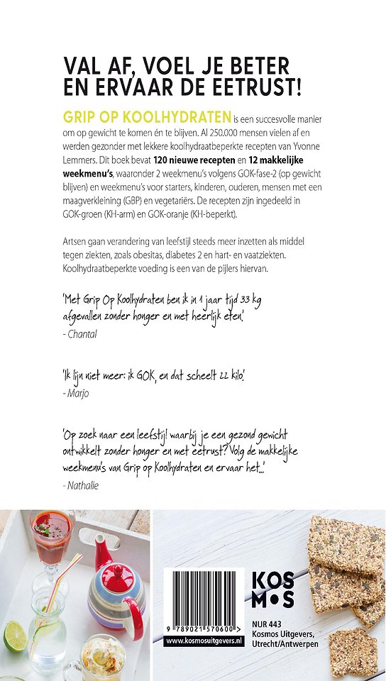 Grip op Koolhydraten is een succesvolle manier om op gewicht te komen en te blijven. Al meer dan 250.000 mensen vielen af en werden gezonder met lekkere koolhydraatbeperkte recepten van Yvonne Lemmers.
