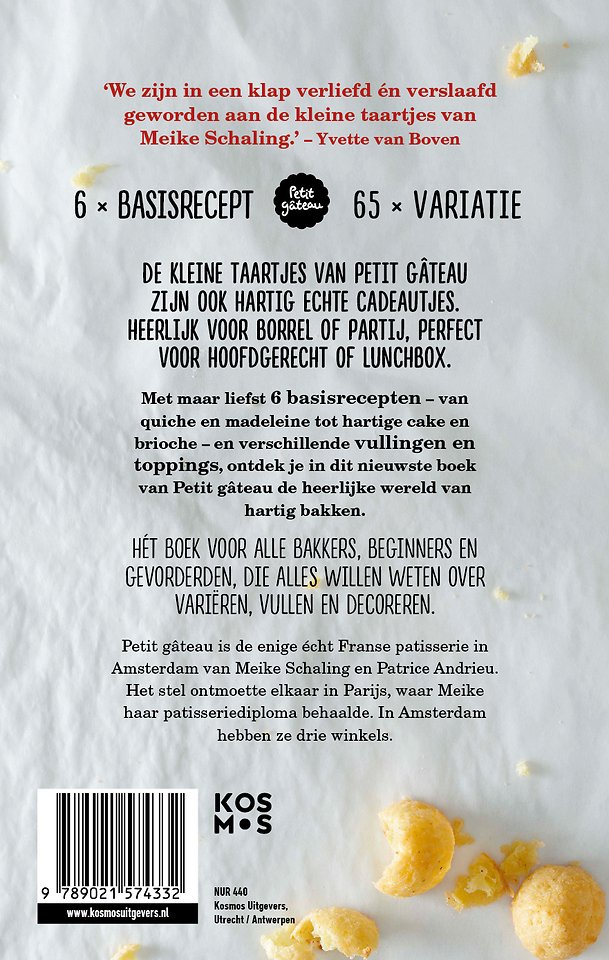 In Kleine hartige taartjes van Meike Schaling vind je culinaire hoogtepunten op een feestje, borrel of partij. Want de tartelettes van Petit gâteau zijn niet alleen heerlijk als ze zoet zijn. Dit bakboek bevat maar liefst zes basisrecepten – van quiche en madeleine tot soes – elk met verschillende vullingen en toppings. De taartjes passen ook nog eens perfect in je lunchbox! Dit is hét boek voor zowel gevorderde als beginnende hartige bakkers.