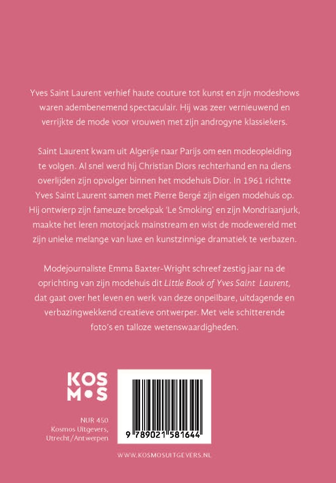 In Little Book of Yves Saint Laurent lees je alles over zijn ontwikkeling van modestudent tot rechterhand van Christian Dior. In 1961 richtte Yves Saint Laurent samen met Pierre Bergé zijn eigen modehuis op. Hij ontwierp het beroemde broekpak ‘Le Smoking’ en zijn Mondriaanjurk, maakte het leren motorjack mainstream en wist de modewereld te verbazen met zijn unieke mix van elegantie en artistiek drama in zijn ontwerpen.