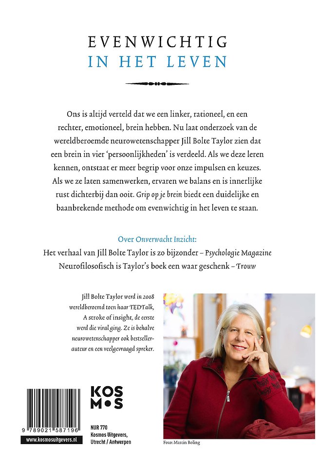 Misschien heb je zoals zoveel anderen geleerd dat je een linker, rationaal, en een rechter, emotioneel, brein hebt. Maar nu laat onderzoek van de wereldberoemde neurowetenschapper Jill Bolte Taylor zien dat een brein uit vier 'persoonlijkheden' bestaat. Als we deze leren kennen, kunnen we meer begrip krijgen voor onze impulsen en keuzes. En als we ze laten samenwerken, ervaren we balans en innerlijke rust zoals nog nooit tevoren.