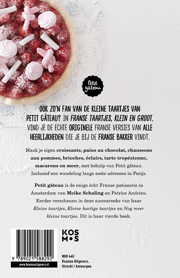 Na het succes van Meike Schalings Kleine taartjes, Kleine hartige taartjes en Nog meer kleine taartjes is hier Franse taartjes, klein en groot. In dit nieuwe boek deelt de eigenaresse van Petit gâteau, de enige écht Franse patisserie in Amsterdam, alle geheimen voor het maken van de klassiekers die je bij de Franse bakker vindt. Onder meer de croissant, pain au chocolat, chausson de pommes, brioche, éclair en Tropézienne.