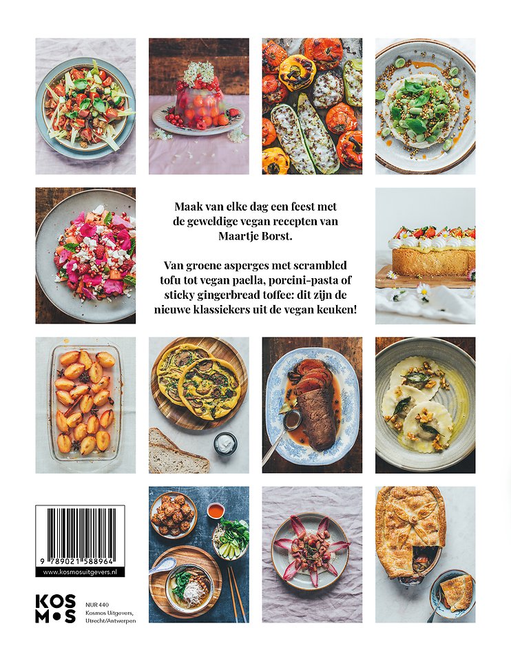 Met haar kookboek Elke dag feest - Koken volgens de seizoenen - 100% vegan laat Maartje Borst zien dat plantaardig eten het hele jaar door heerlijk is. Voor dit feestelijke vegan kookboek liet ze zich inspireren door seizoensproducten. Dat levert heerlijke gerechten op, van groene asperges met scrambled tofu tot vegan paella, porcini-pasta of sticky toffee pudding.